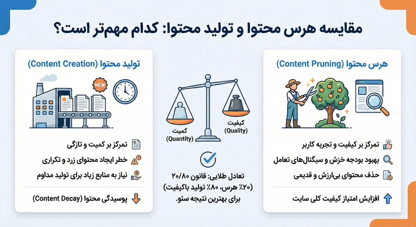 هنر سئو در ایجاد تعادل است. شما نمیتوانید فقط هرس کنید تا جایی که سایت خالی شود، و نمیتوانید فقط تولید کنید تا جایی که سایت منفجر شود. یک قانون نانوشته در بین سئوکاران حرفهای وجود دارد: قانون ۲۰/۸۰ نگهداری. شما باید ۲۰ درصد از وقت و منابع محتوایی خود را صرف بازبینی، آپدیت و هرس ۸۰ درصد محتوای قدیمی کنید.