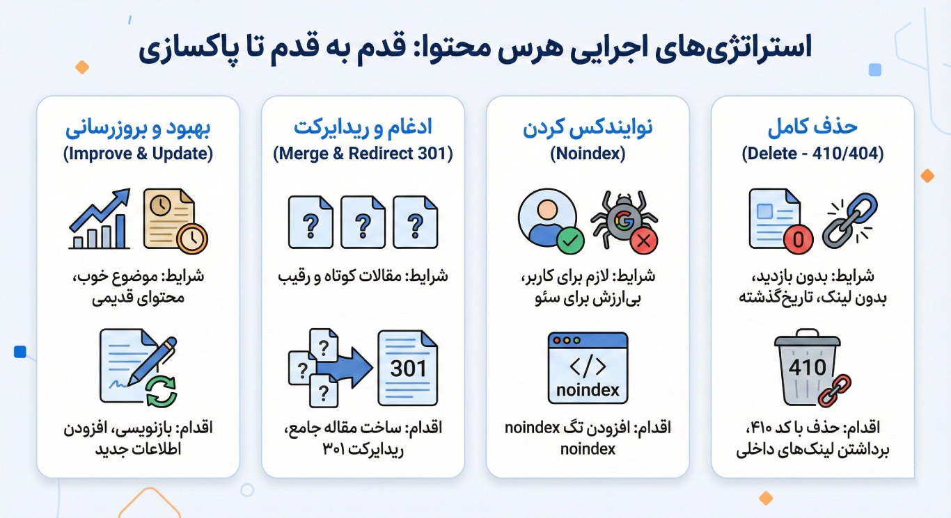 حالا که دادهها را استخراج کردید و لیست صفحات مشکلدار را دارید، وقت عمل است. اما مراقب باشید! هر اقدامی روی URLها میتواند خطرناک باشد. برای هر صفحه از لیستتان، باید یکی از ۴ استراتژی زیر را انتخاب کنید: